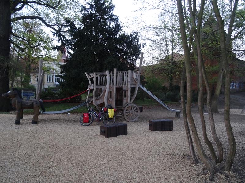I spend the afternoon unsuccessfully cycling around Cottbus looking for a front rack. None of the shops I visit are forthcoming about other cycle shops despite not being able to assist me and I find more of the shops myself, by good luck. By this time it is very dark and I decide to spend the night in the town and check out the last spotted shops in the morning when they are open … so obviously not finding a campsite I decide to sleep in a very nice looking, wooden carriage in a childrens play park!
